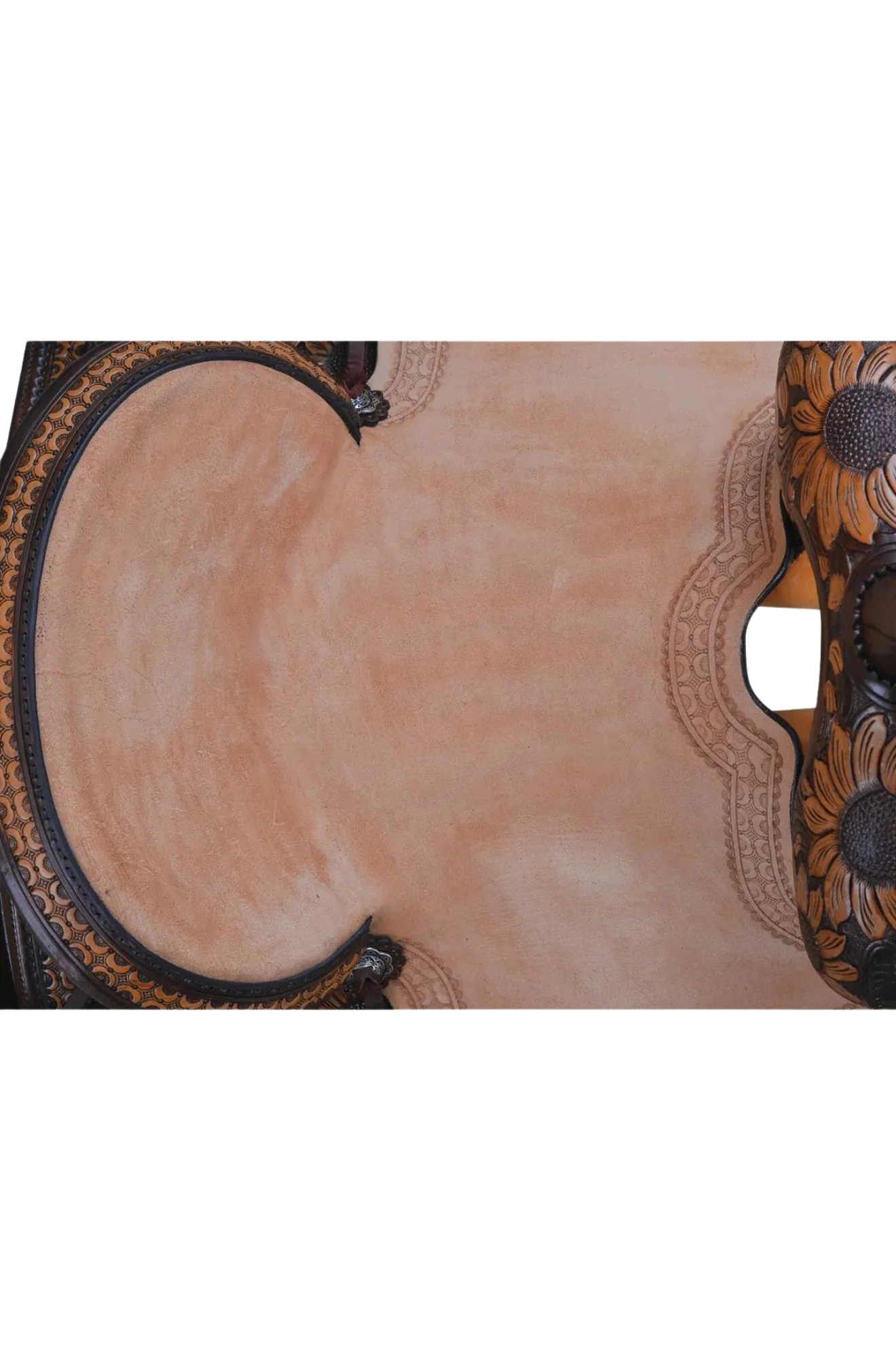 Designed with Martha Josey to provide a secure seat that's comfortable and performance-ready, the MJ51 Josey Cash You Are My Sunshine saddle is loaded with her favorite features and designed to impress. Custom border tooling accents the bold sunflower design of the skirts, and is enhanced with rich vintage leather. The matching flank cinch is included.