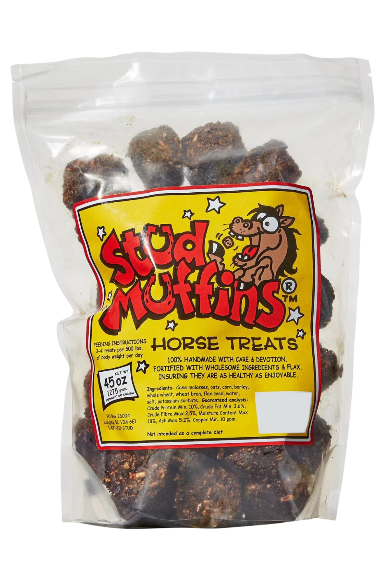 Your horse will love the Stud Muffins Horse Treats. Made 100 percent by hand with love and devotion, these tasty and nutritious treats are the ultimate reward, whether you have one horse or an entire stable. The recipe starts with good-for-them grains like wheat, oats, barely and corn, and then it’s fortified with flaxseed and other wholesome ingredients—and it’s all to make sure they’re as healthy as they are enjoyable. Perfect for training and picky eaters, horses go crazy for them!
