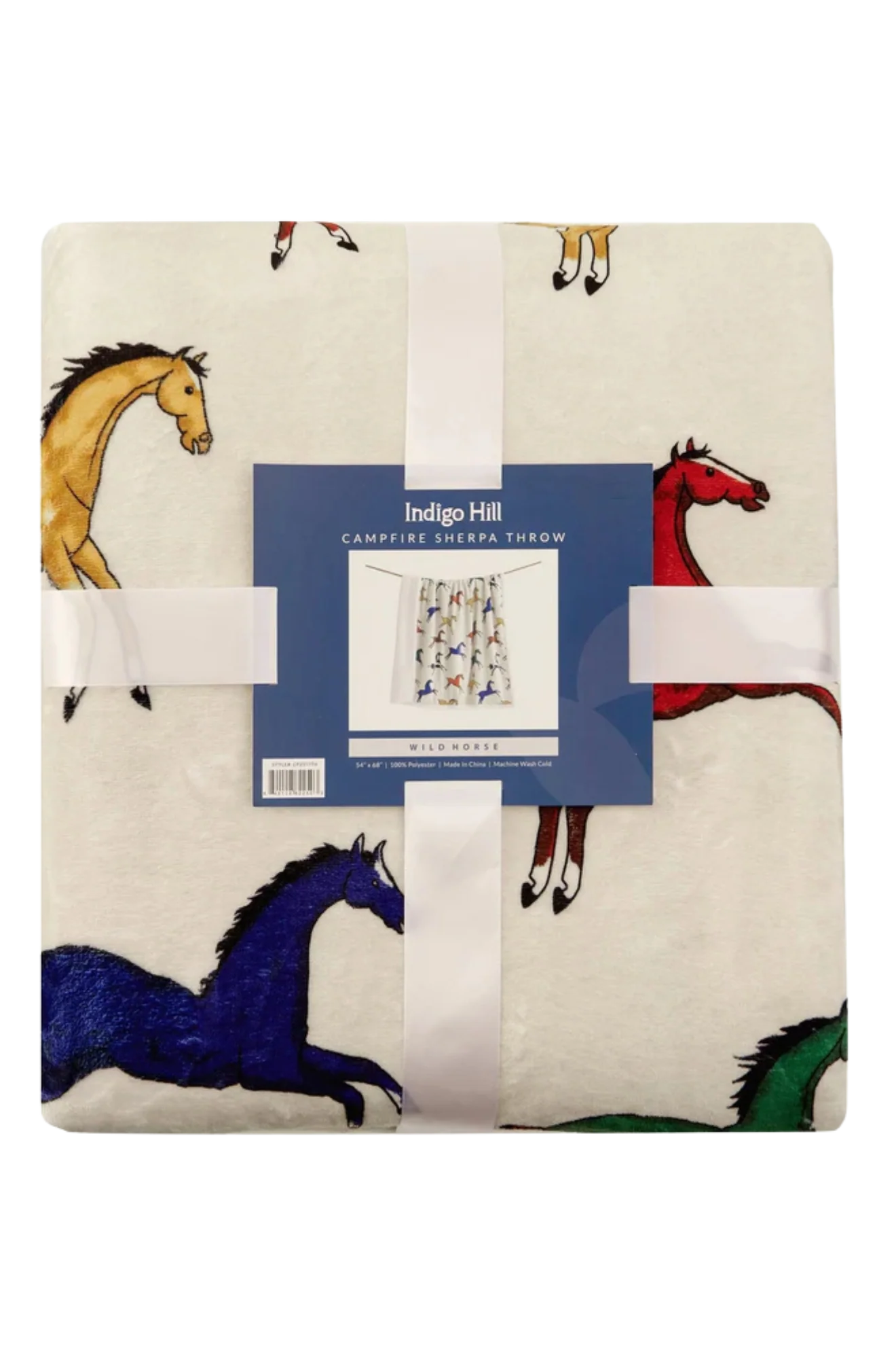 The Wild Horses Campfire Sherpa Throw is a striking, budget-friendly accent piece that draws its inspiration from hand-painted horses in Victorian-era children's books. The exuberant horses sprint across a Southwestern desert, their bright primary colors harmonized by the throw's neutral backdrop. The reverse reveals a cozy sherpa lining for added warmth. Lightweight yet soft, this Western throw is versatile, perfect for both home and outdoor use.Â